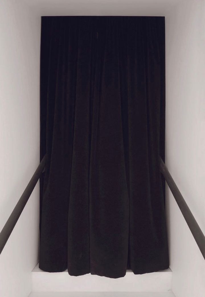 黒いカーテンがかけられた空間。<em>Room,</em> 2014, external skin: 8mm thick stainless steel with original mill scale finish, internal cladding: dark fumed oak, 1006 × 650 × 790 cm. Permanent installation, Beaumont Hotel, London. Photograph by David Grandorge. Hearst Owned