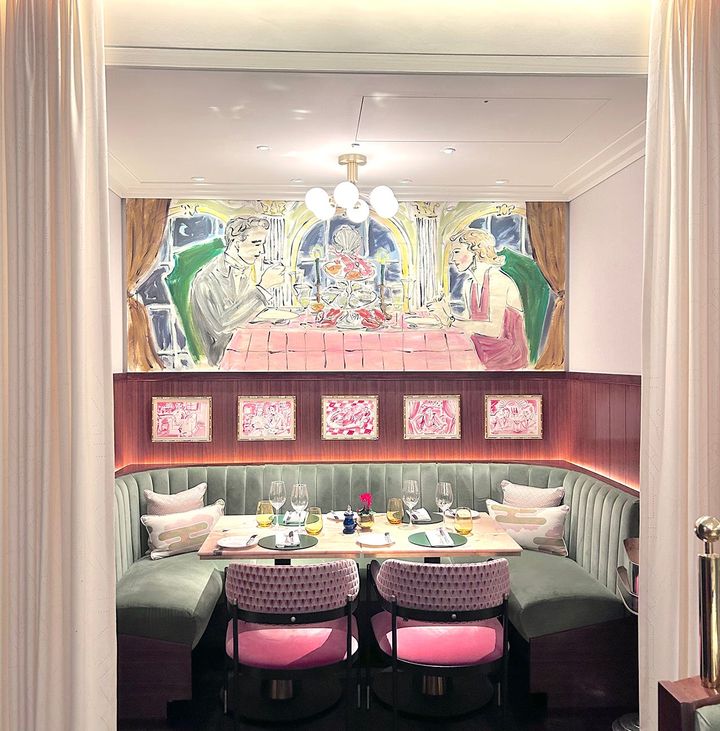昨年10月、ホテル内にオープンしたレストラン「Rosi」の壁画は、英国を拠点にファインアートとデザインの領域を横断し、数々のラグジュアリーブランドとも協働してきたルーク・エドワード・ホールによるコミッション作品。 Photo:Yuki Kos
