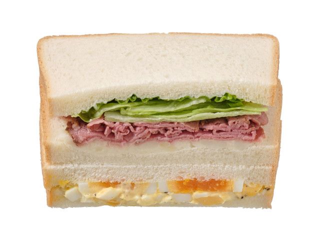 ローストビーフ層にはローストビーフと炒め玉ねぎ、レタス、たまご層はトリュフがふわっと香るたまごサラダをはさんだ、ちょっと贅沢なサンドイッチです。