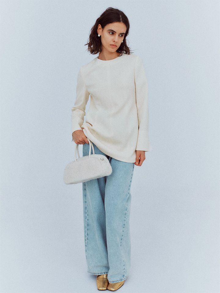 1枚で着ても寒々しさがない、ほどよく厚みがあるウール100%。ハリのある素材で、くびれシルエットもくずれにくい。黄みがかかったアイボリーは似合う色が多く、ロンTのようにどんなコートやボトムともちぐはぐせずなじむ。そで口にスリットが入っており、折り返すとシャツをロールアップしたようなデザインに。