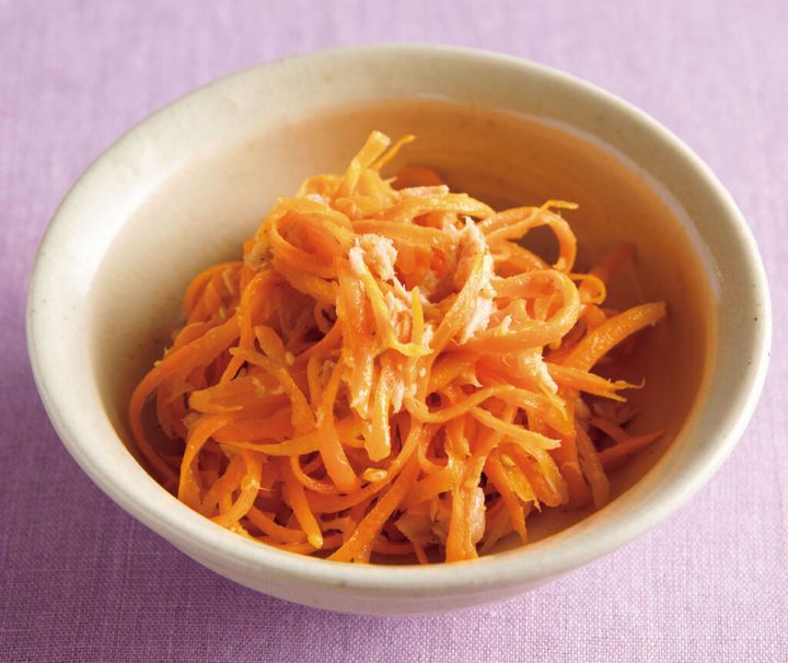 (1)にんじんは皮をむき、あればスライサーでせん切りにする。ボールに入れて塩をふり、全体になじませてから10分ほどおく。