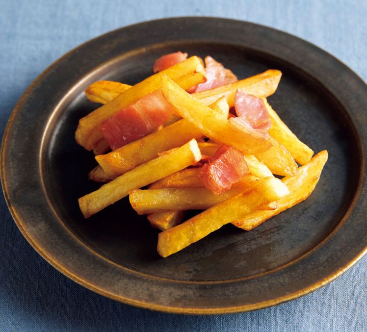 (2)フライパンにサラダ油を弱めの中火で熱し、じゃがいもの水けを拭き取って入れる。ときどき返しながら、10分ほど炒める。じゃがいもの表面がカリッとしたら余分な油を拭き取り、ベーコンを加えてさっと炒める。バター、しょうゆを加えて炒め合わせる。