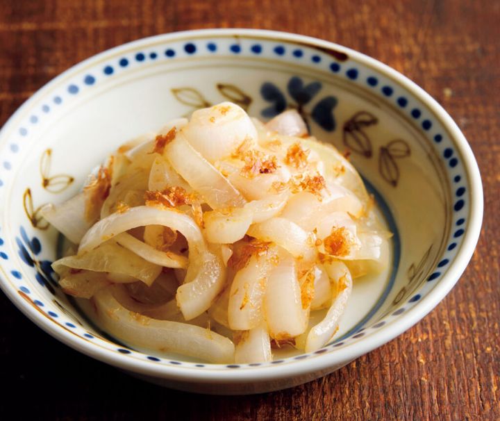 (2)フライパンにサラダ油を中火で熱し、玉ねぎを入れて炒める。しんなりしたら塩、削り節をふり入れて炒め合わせる。
