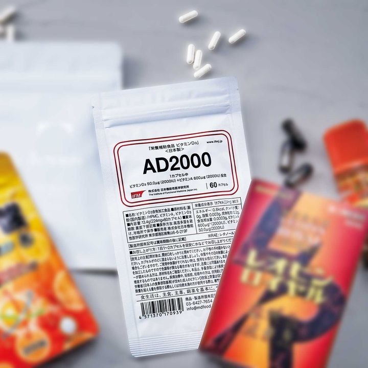 1カプセルにビタミンD3とビタミンAをそれぞれ2,000IUの高配合。60カプセル ¥4,320(日本機能性医学研究所)