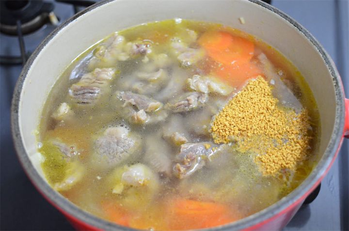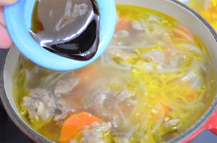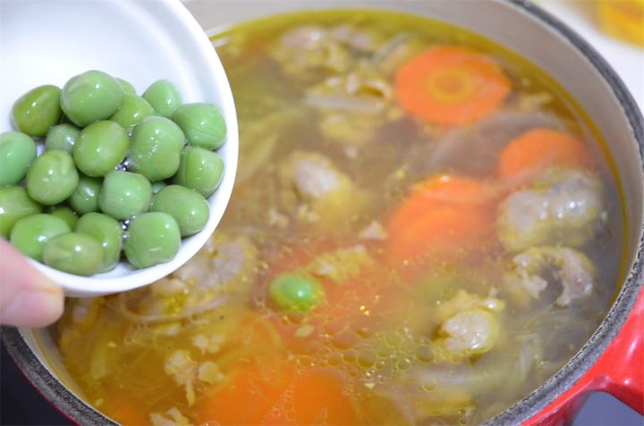 5. 2の牛すじ肉を4の鍋に入れ、水、コンソメを入れて沸騰したら弱火で20~30分煮込み、オイスターソースを入れ、グリンピースと塩、粗挽き黒こしょうで味をととのえる。