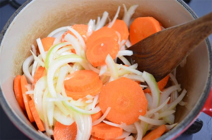 4. 鍋にオリーブオイルを入れ、にんにくを香りが立つまで炒め、玉ねぎ、にんじんを加えて中火で5分炒める。