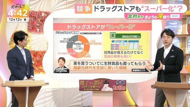 スーパーだけでなく、ドラッグストアも“スーパー化”が進んでいます。お店に入ると日用品が買えるだけでなく食品の価格も安く設定されていたりします。高齢化時代を念頭に置いて「薬を買うついでに生鮮食品も買ってもらおう」という戦略なのだそうです。