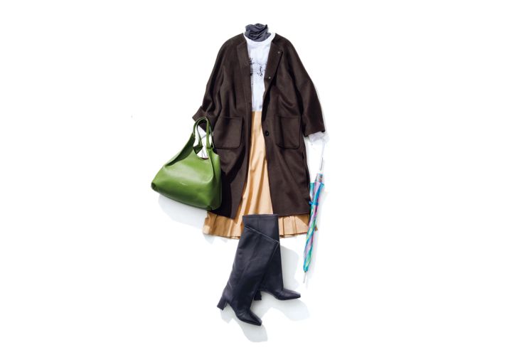 ロングコート¥27,000/PLST プリントTシャツ¥18,700/スリードッツ(スリードッツ表参道店) タートルネックインナー¥2,290/UNIQLO:C(UNIQLO) サイドプリーツスカート¥24,200/アルページュストーリー トートバッグ¥75,900/ジャンニ キアリーニ(ジャンニ キアリーニ 銀座店) ロングブーツ¥79,200/ファビオ ルスコーニ(エリオポール代官山)傘/編集部私物