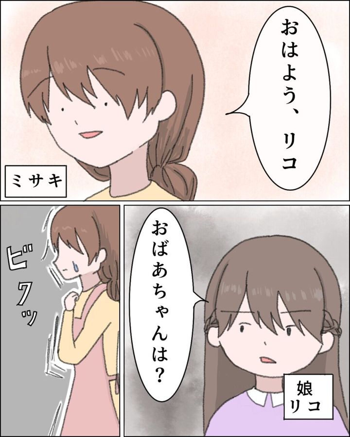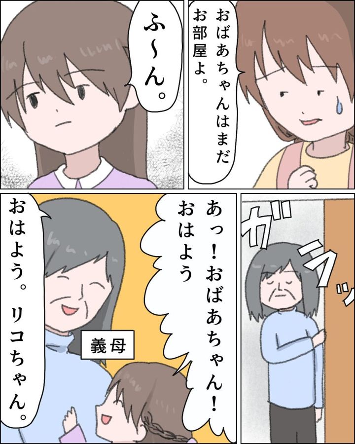 しばらくして同居の義母が起きてくると、パッと明るい笑顔になったリコが義母に「おはよう」と飛びつきます。義母も笑顔。こんな幸せそうな2人を目の前にして、私は心がズキズキします。