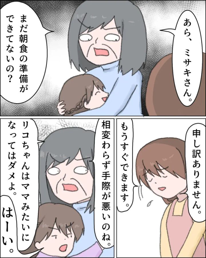 「あら、ミサキさん」と私に向けられた義母の顔は、もう厳しいものに変わっていました。さっきのリコの顔そっくり。朝食の準備ができていないと文句を言われて、もうすぐだと伝えると、手際の悪さにまた文句を言われてしまいました。さらにはリコに、私のようになってはダメと聞こえよがしに言う義母に、私の方を見ながら「はーい」と意地悪な顔を向けるリコ。