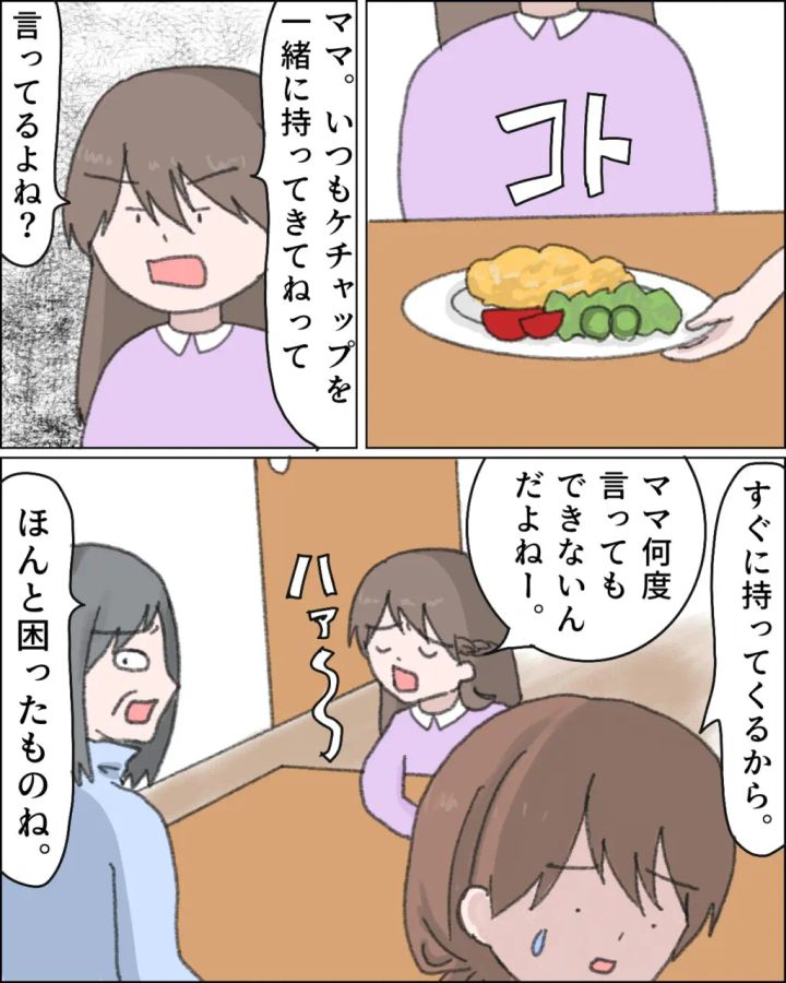 毎日こんな感じで、私は何も言わずにとにかく急いで朝食の準備をしてリコに出しました。するとイライラしたようにケチャップが無いと文句を言い、何度言ってもできないとため息をつくリコは、本当に義母そっくりです。