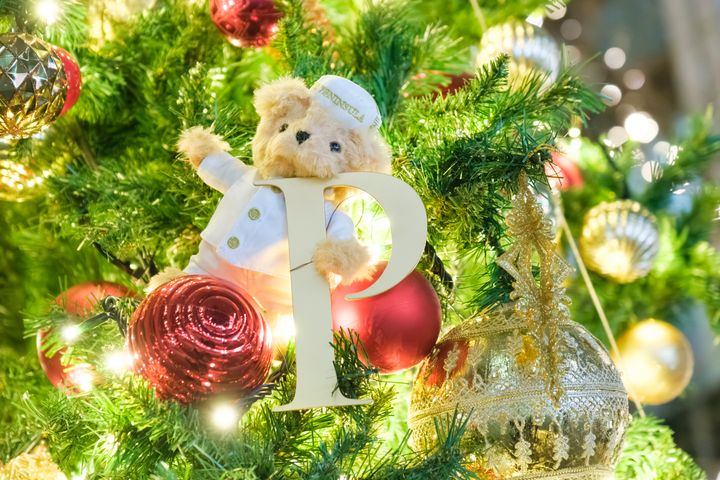 メインツリーの高さは約5メートルあり、オーナメントと電飾をたっぷりとまとって。晴海通りと丸の内・仲通りの交差点で、多くの人が足を止めて見上げています。その中にはホテルロゴの「P」を持ったベアもいますが、その秘密は後ほど……。