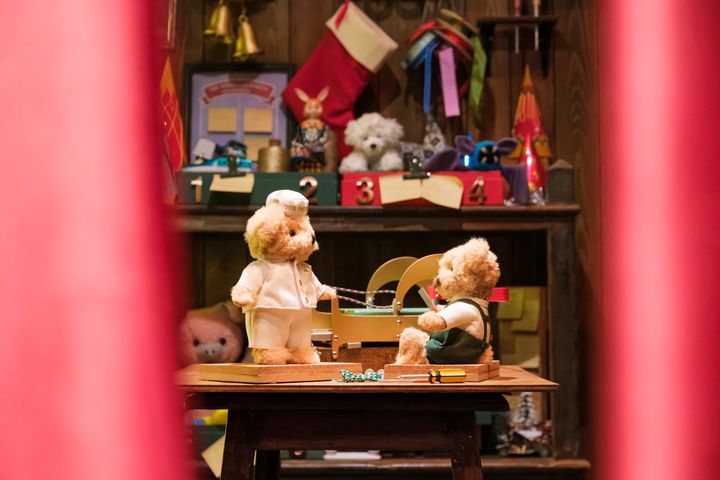 営業時間外も少しだけあいているおもちゃ病院のカーテンを覗いてみると、ベアたちがなにか作業しているのを観ることができますよ!