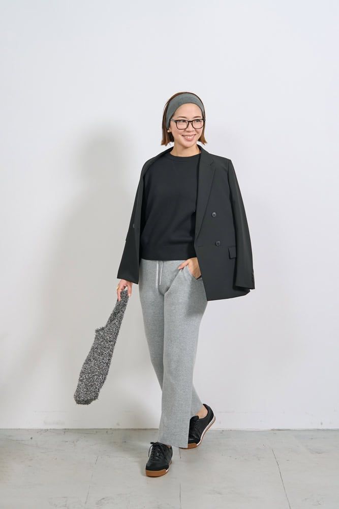 「全体を引き締めてクールに見える黒ジャケットは、どんなスタイルにも馴染む万能アイテム。カジュアルなニットパンツとの相性もよく、抜け感が出てモード感が増します。トップスは、スウェット見えするニットなのでカジュアルダウンし過ぎず、黒でまとめることで全体的に統一感が生まれ、キレイめカジュアルなほぼ黒コーデにまとめました。」