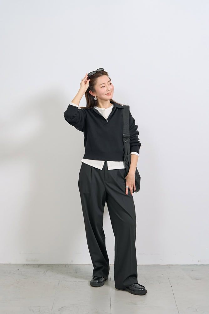 スムースコットンポロセーター¥3,990 ポインテール カーディガン¥1,990 タックワイドパンツ¥3,990 パフィーショルダーバッグ¥2,990 サングラス/レクタングル¥2,490(すべてユニクロ/ユニクロ)※セーターはSサイズ、カットソーとパンツはMサイズを着用 靴(私物)