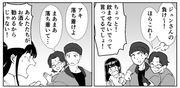 ジュンさんは飲んでも悪酔いしたりしないはずなのに……。私も少し酔いが回っていたし、話しているうちにだんだん興奮してきて、いつの間にか声が大きくなっていました。その後、なんとなく場の空気が冷めてしまい、盛り上がっていた雰囲気もどこか静まります。