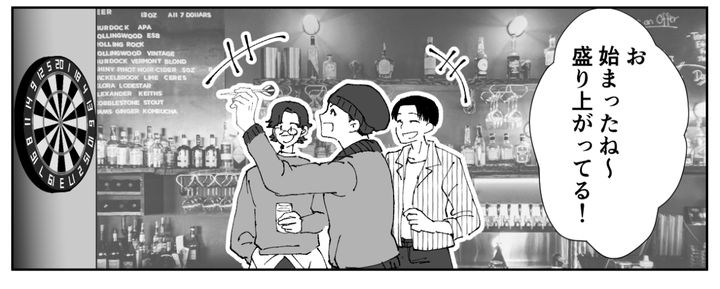 私がマコとカウンターで飲んでいると、ツトムさんを含めた男性陣がダーツを始めました。
