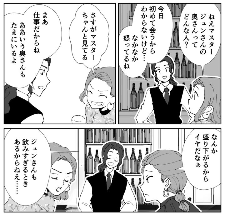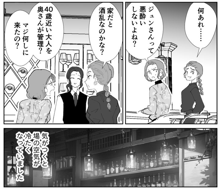 私(レイナ、35歳)には独身の頃から通っているバーがあります。友人のマコ(35歳)に紹介されたバーで、飲み仲間は10人ほど。10年くらいの付き合いになります。私が久しぶりにバーへ行くと、マコやツトムさん(40代)、ジュンさん(39歳)がいました。今回はジュンさんの奥さん(アキ、36歳)も一緒です。しかし奥さんは何度もジュンさんの飲酒量を制限し、場の空気を悪くするほど声を荒げます。その様子に私は違和感を抱きました。