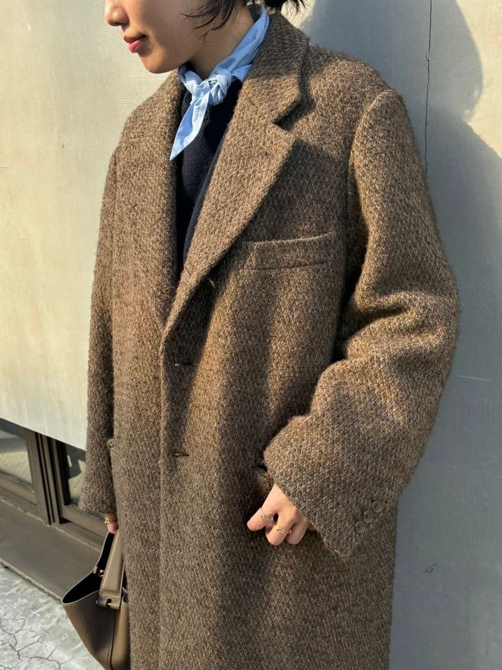 「インポートファブリックならではの風合いが際立つ、トレンドムード漂うチェスターコートのスタイリング。ニュアンスの効いたブラウンにあえて鮮やかなブルーシャツを差し色としてプラスすることで、クラシックなコートから覗くカラーリングに軽さと洒落感を演出しました。落ち着きのある配色の中にさり気なく旬を感じさせるスタイルにしたのもポイントです」