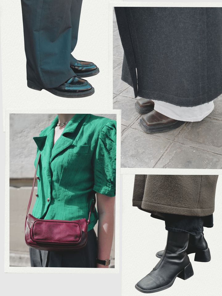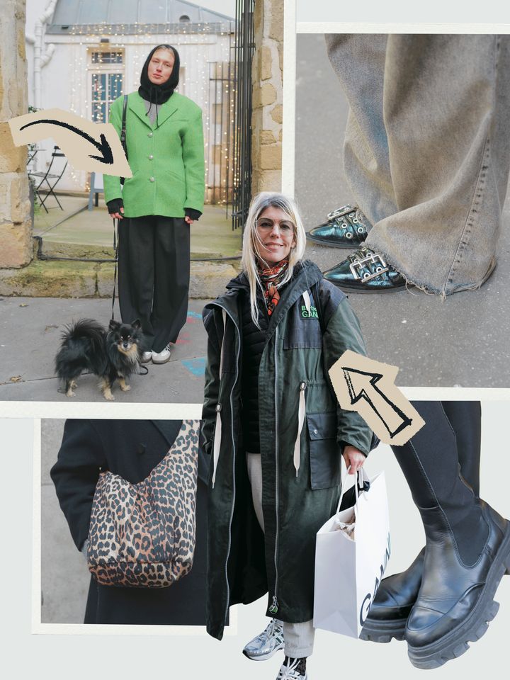 ネオングリーンのジャケットやレオパード柄バッグなど、パリジェンヌたちは「ガニー」らしい遊び心やインパクトのあるアイテムを上手に着こなしにミックス。ファッショニスタからの人気が高いリサイクルラバーブーツの愛用者もちらほら。