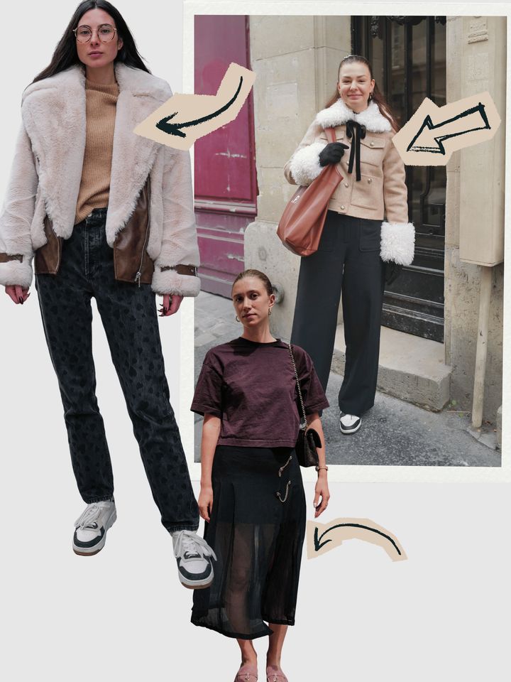 インパクトのあるファージャケットやシースルーのスカートなど、個性が薫るアイテムを選んで、シンプルスタイルのアクセントに投入。ミックス感のある着こなしが上手なパリジェンヌらしい着こなしを楽しんでいるよう。