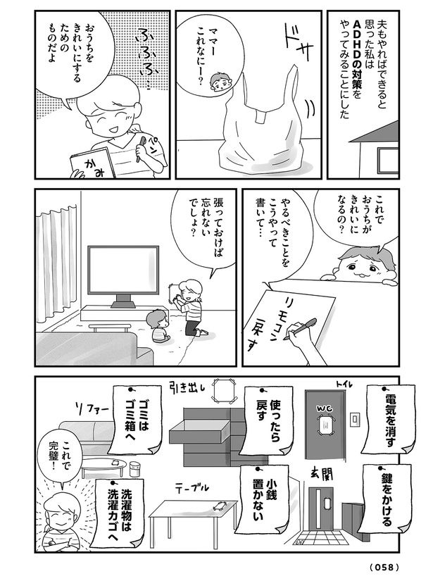 妻が夫のADHD対策を開始! やりっぱなしを解消するため家中にメモを貼るが…/もしかして、うちの夫はADHD?④