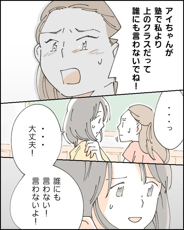 「アイちゃんが塾で私より上のクラスだって誰にも言わないでね!」ヨウちゃんに詰め寄られ、「・・大丈夫!誰にも言わない!言わないよ!」とアイは答えたようです。