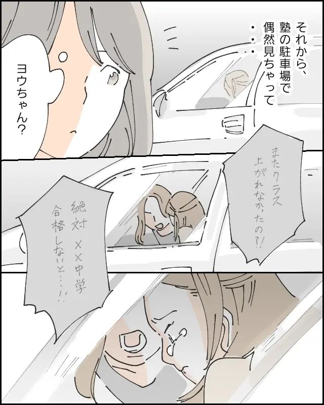 「ヨウちゃん?」車の中で女性と子どもが言い争っている声が聞こえ、何事かと思っていると、「またクラス無かったの!?絶対××中学に合格しないと・・!!」と声が聞こえ、助手席にいるヨウちゃんが目に涙をためているのが見えたのでした。