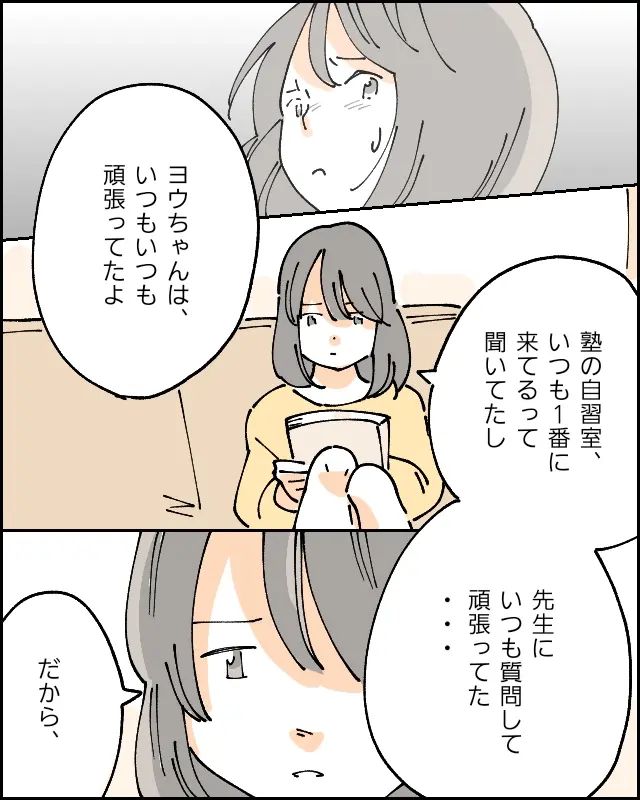 「ヨウちゃんは、いつもいつも頑張ってたよ。塾の自習室、いつも1番に来てるって聞いたし、先生にいつも質問して頑張ってた・・だから」とアイはこれまでのことを振り返りながらそう言うと、