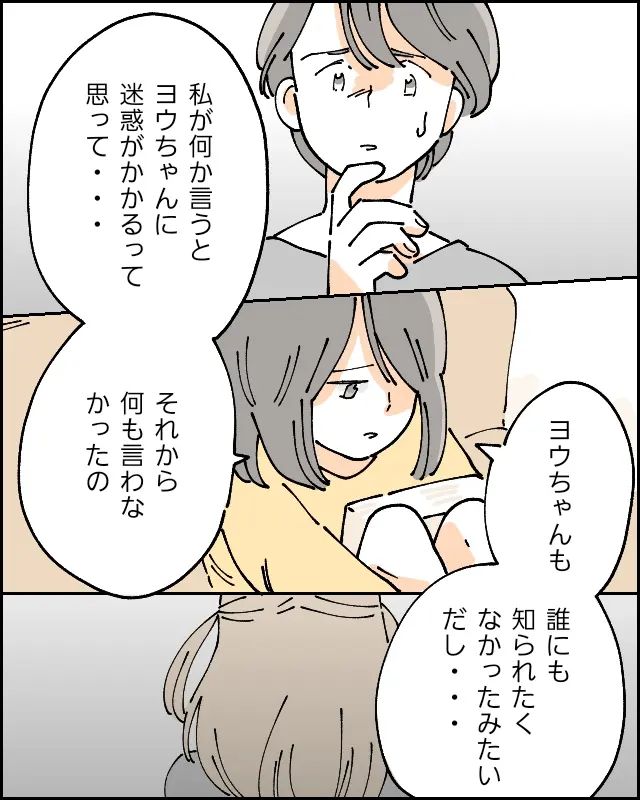 そして、「私が何か言うと、ヨウちゃんに迷惑がかかるって思って・・それから何も言わなかったの。ヨウちゃんも誰にも知られたくなかったみたいだし・・」下を向いて話すのでした。