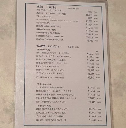 メニュー表はこちらです。 「煮込みハンバーグ」や「マルゲリータ」、スパゲティは「トマトソース系」や「クリームソース系」から選べるなど種類豊富!全品サラダ付きです。