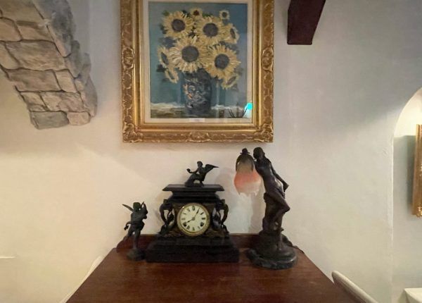 壁に飾られたひまわりの絵も鮮やかで素敵。アンティーク調の置時計も上質な雰囲気があり、どのインテリアも魅力的でしたよ♪