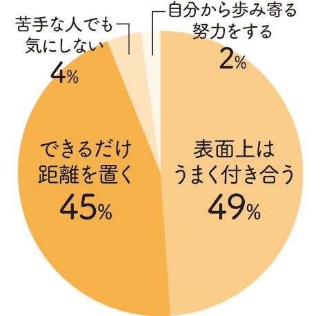 ▶生理的に合わない人とは距離をおきます。そうでない人とは会話する機会はあれば歩み寄る気持ちで会話して今後の付き合い方を選びます(N・M/営業事務)