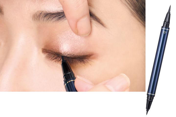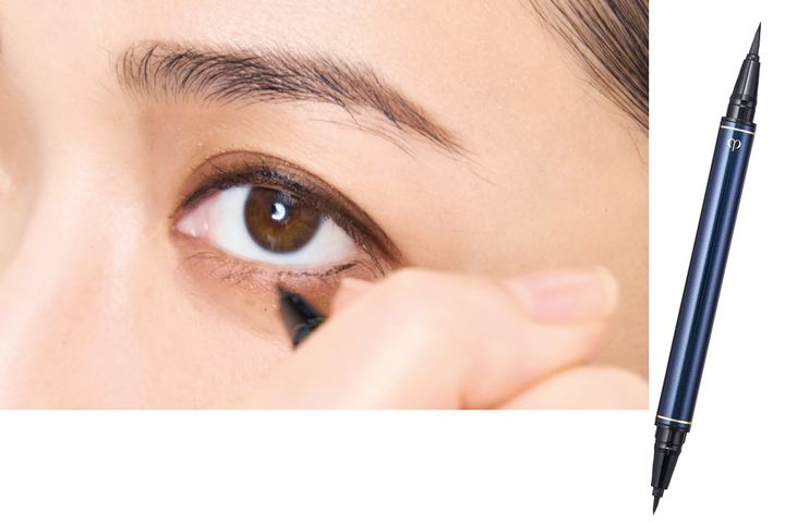 リキッドアイライナーのブラシ(上側)で目尻からと目頭から極細のライン引いて繋げます。さらにチップタイプ(下側)で、上下のまつ毛とまつ毛の間を点で埋めます。フレームラインを丁寧に仕上げることで、目元全体がぐっと引き締まった印象に。クレ・ド・ポー ボーテ ライナーリキッドアンタンス 2ブラウン ¥5,500(クレ・ド・ポー ボーテ)
