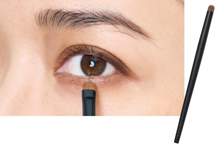 ラウンドブラシを使用し、目尻1/3にAを入れ、さらにBとEを混ぜながら取り、下まぶたに入れたシャドウの外側から目頭側までぼかして馴染ませます。下まぶたに明るい色を足すことで、くぼんだ目元にハリ感が生まれふっくらとして目が大きく見えます。目元のくぼみのせいでできてしまった影が飛んで、明るくなります。THREE シュルームブラシ ¥3,850(THREE)