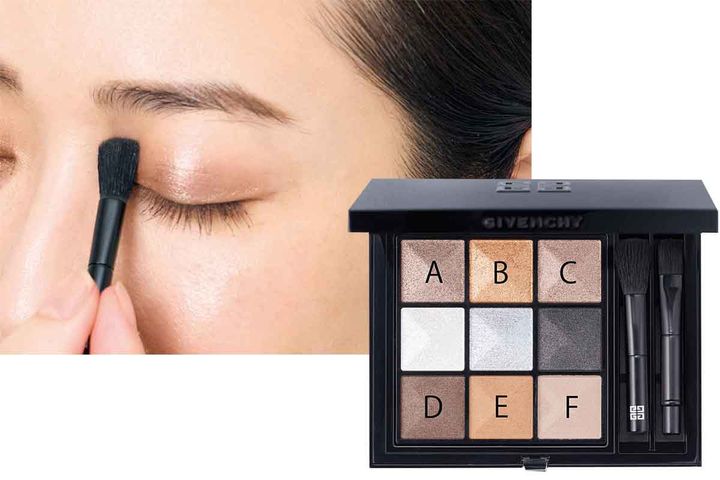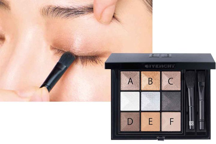 1.AとCを付属の大ブラシで二重幅からアイホールに広げ、指で馴染ませます。