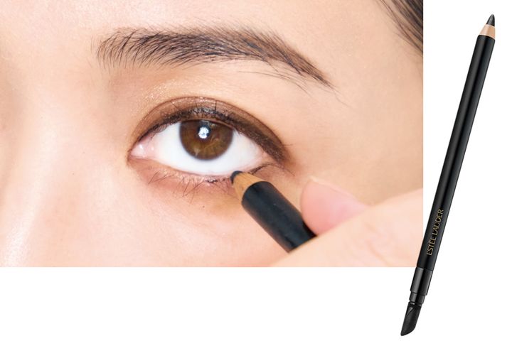 さらに黒のペンシルで下まぶた目尻のインサイドにごく細いラインを引きます。がっつり入れすぎると、ちんまり目になるので、かすれるほどの力加減が◎。自然なニュアンスを与え、奥行きのあるアンニュイな眼差しを叶えます。なめらかなラインが描きやすい。ダブル ウェア ウォータープルーフ ジェル アイ ペンシル 01オニキス¥4,950(エスティ ローダー)