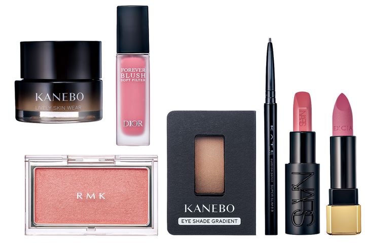 (左上から)さっと塗るだけ。厚塗り感ゼロでカバー力も抜群。カネボウ ライブリースキン ウェアⅡ SPF4・PA+ 全10色 30g ¥12,100(カネボウインターナショナルDiv.)、ピンクのチークを頰の中心に、その周りに肌馴染みの良いベージュピンクをぼかします。ディオールスキン フォーエヴァー ブラッシュ ソフト フィルター 05リリー ¥5,940(パルファン・クリスチャン ・ディオール)、RMK ピュア コンプレクション ブラッシュ16Pink Pulse ¥3,630(RMK Division)、濃淡のグラデーションで自眉のような仕上がりに。カネボウ アイシェイドグラディエントEG2 Warm Brown ¥2,750(カネボウインターナショナルDiv.)、極細芯でリアルな毛が描きやすい。ケイト アイブロウペンシルスーパースリム0.8 BR-3 ¥1,100〈編集部調べ〉(カネボウ化粧品)※10/25発売、2色を重ねることで立体感を強調、唇がふっくら。NARS エクスプリシット リップスティック 828 ¥5,280(NARS JAPAN)、エクシア ルージュ レヴェランス 04 ローズミスト ¥6,600セット価格(アルビオン)