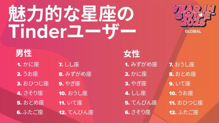 ランキングの中には、グローバルなTinderユーザーを対象にした、「魅力的な星座のTinderランキング」というユニークなテーマもありました。