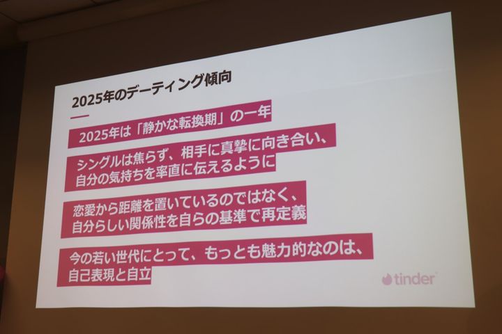 2025年のデーティング傾向は「静かな転換期」だそう。“恋人がいる”がステータスだった時代から少し動きがあり、まずは自己表現や自立を大切にしたいと考え、自分の気持ちをより率直に伝える傾向が見られたとのこと。「相手に真摯に向き合って、より感情表現が豊かになりました」とTinder広報の武村さんは話します。