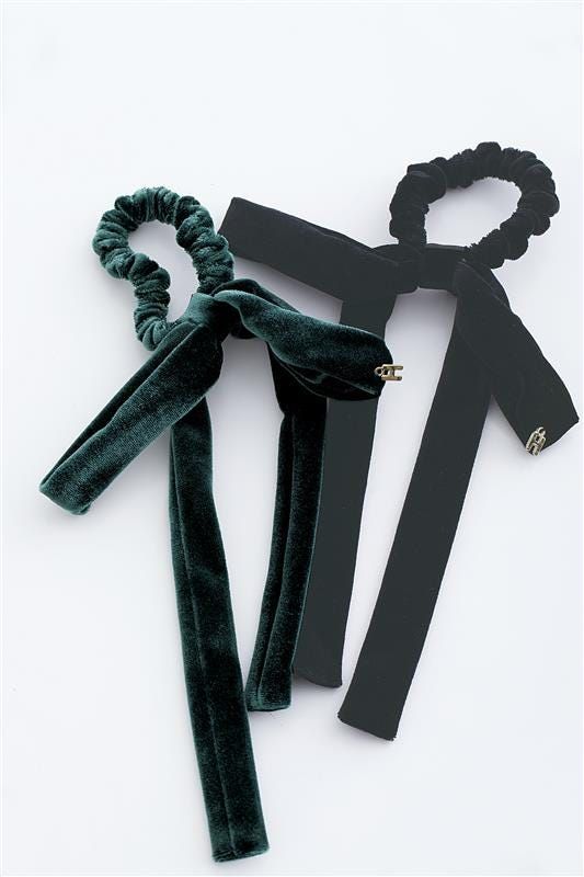 ザ ハニーのリボン形シュシュはふたりでシェア。深いグリーンやブラック、ネイビーなど色違いで活用中。