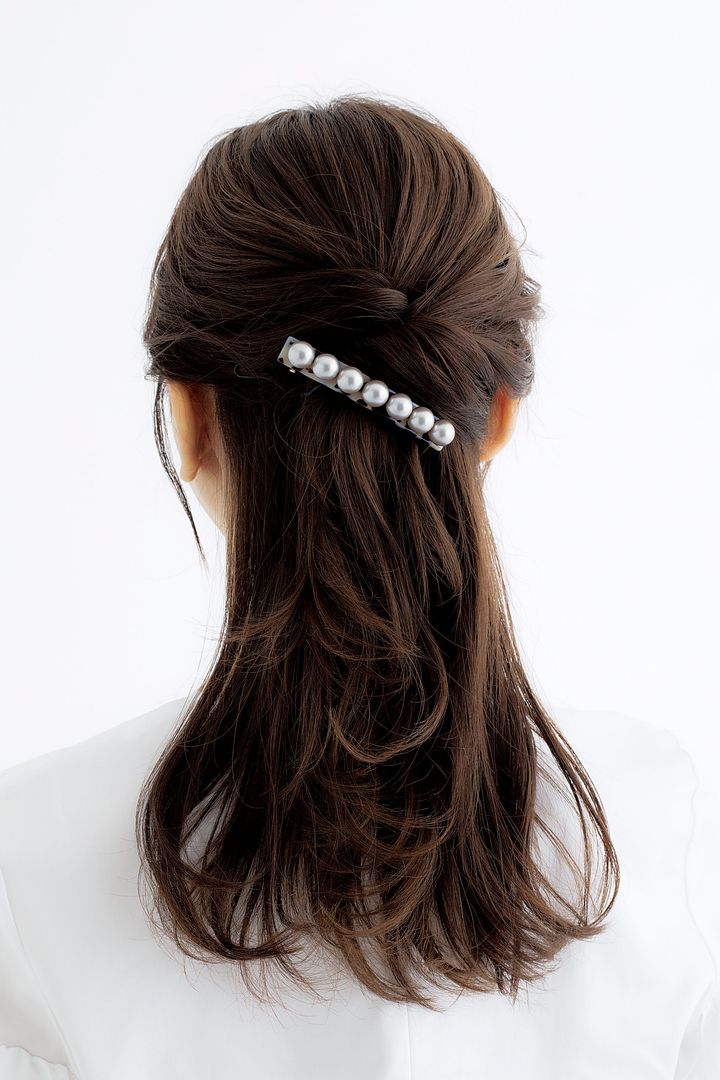 十和子:ミニマルで洗練されたデザインだから、大人も使いやすいと思う。ポニーテールやハーフアップのときにゴムを隠すのも簡単にできるしね。リボンの他には、王道のパールモチーフもおすすめ。ハーフアップにパール系バレッタをつけるだけでエレガントな印象になるから。