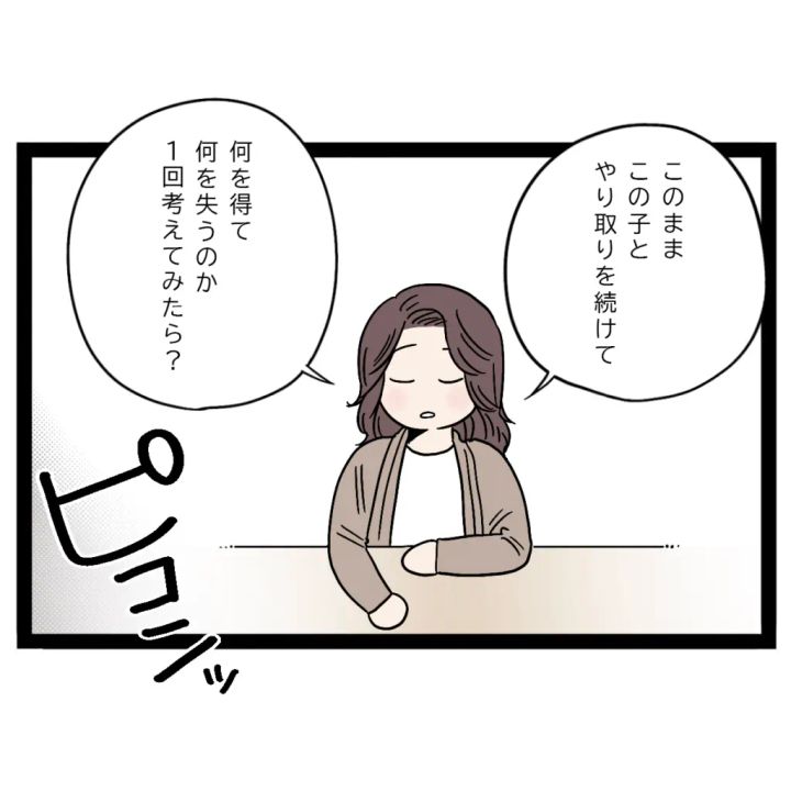 「このままこの子とやり取りを続けて、何を得て何を失うのか1回考えてみたら?」目の前のレイ子しか見えていないまさひでに、本当に大切にすべきなのは何かを問いかけました。するとその瞬間、まさひでのスマホに1件のメッセージが届きました。