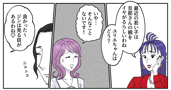 年配の女性が親しげにジンくんに話しかけてきたので、最初は知り合いか職場の人かなと思ったそうです。しかしその人はジンくんのお母さん! ユリエは慌てて「はじめまして、スズキユリエと申します」と丁寧に挨拶をしました。