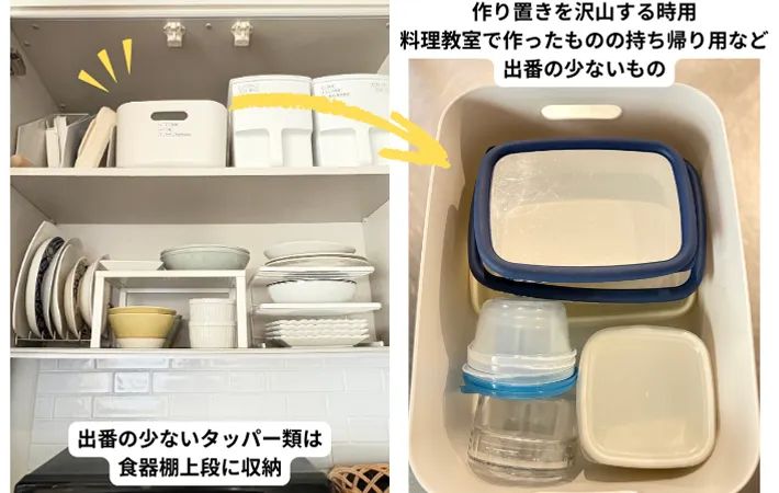 タッパーだからといって、すべて同じ場所に収納しなくても大丈夫。出番の多いものとたまにしか使わないもので、分けて収納するのも1つの手段です。