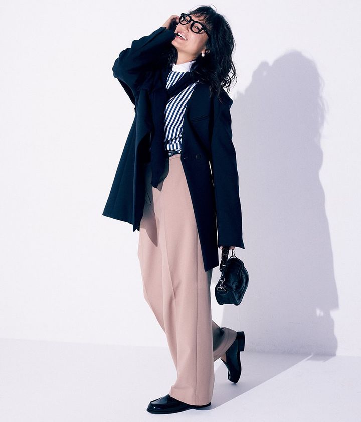 ワイドパンツ¥14,000(プラステ)ジャケット¥154,000(エストネーション)ストライプシャツ¥53,900(セブリン/アマン)肩がけしたニット¥29,700(スローン/ザ ショップ スローン 新静岡セノバ店)バッグ¥157,300(ピエール アルディ/ピエール アルディ 東京)ローファー¥156,200(J.M. WESTON/ジェイエムウエストン 青山店)メガネ¥49,500(モスコット/モスコット トウキョウ)ピアス¥5,400(アビステ)