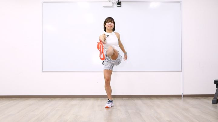 片足を前に蹴り上げ、反対の手を後ろから回してつま先にタッチします。大きな動作を心がけてください。