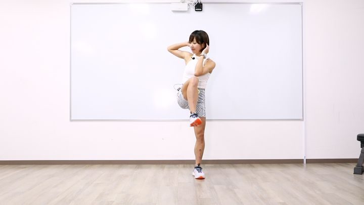 まっすぐ立った状態から、片方の膝とその反対側の肘を、体の正面で引きつけます。左右交互で行いましょう。