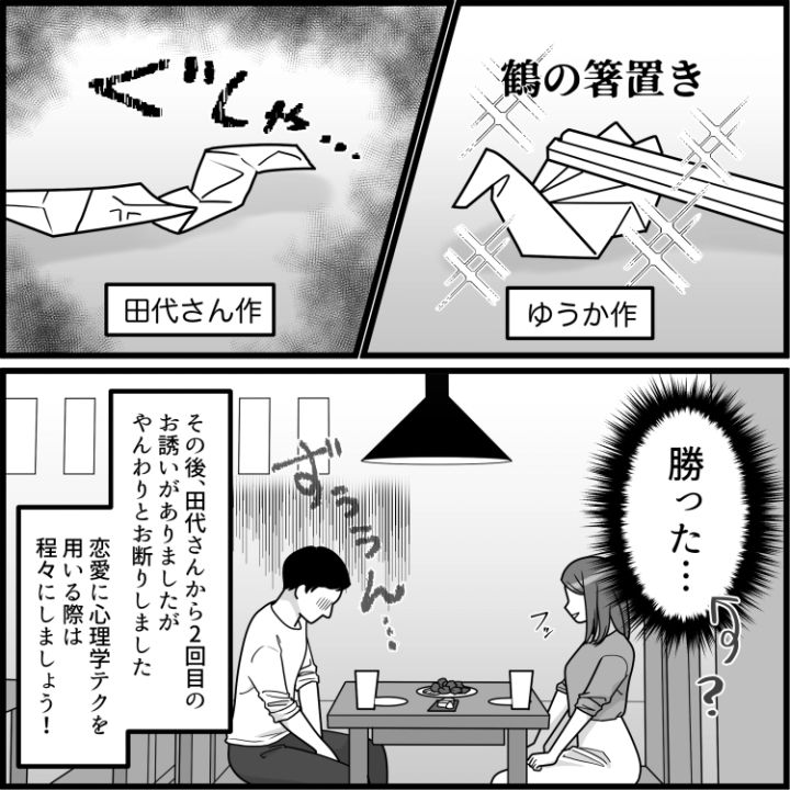 心理学テクニックを意識しすぎた結果、逆効果となってしまった田代さん。恋愛に心理学を応用する際は、程々にしましょうね!