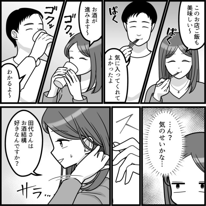 マッチングアプリを使って婚活をしているゆうか。今日はマッチングした田代さんとの初デートだ。好みではないが、優しく真面目そうな彼に好印象を抱くゆうか。しかし、食事中にふと、あることに気付く。それは、田代さんがゆうかの仕草をすべて真似していることだ。不思議に思い本当に彼が真似しているのか確かめてみると、なんと衝撃の展開が!?